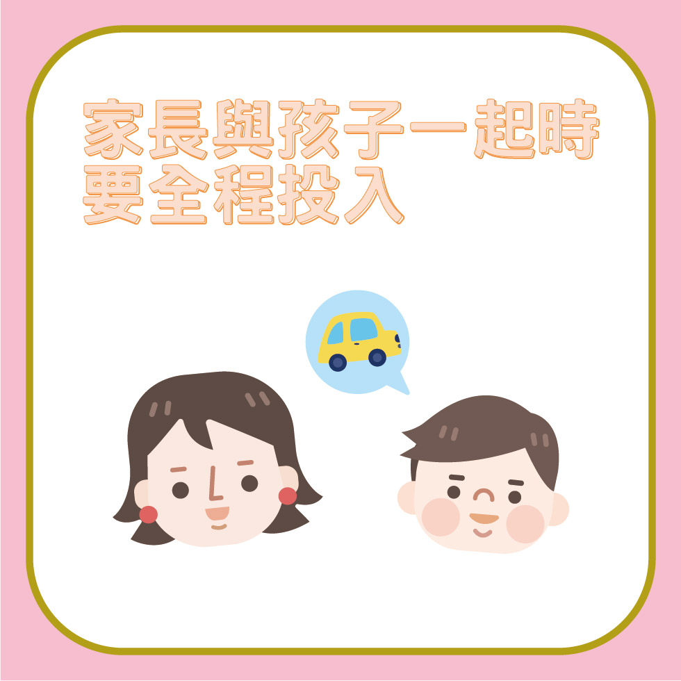 家長與孩子一起時要全程投入,不要介意與孩子玩一些比較幼稚和重複的遊戲,例如與孩子玩「搔癢癢」、唱兒歌或利用洋娃娃玩角色扮演等,讓孩子感覺到家長陪伴和關注。在玩耍時,家長不要只顧指示孩子而忽略他的興趣,例如孩子想玩玩具車,家長可以讓他做主導,配合他一起玩玩具車,這樣孩子便會樂意與家長溝通。