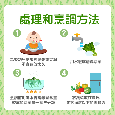 為免嬰幼兒出現「藍嬰綜合症」,家長平時要留意以下四大處理及烹調蔬菜的正確方法。