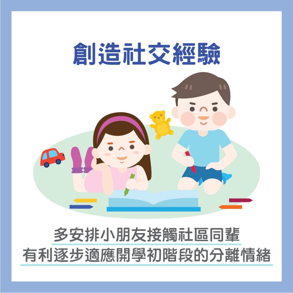 家長可以多安排小朋友接觸社區同輩,如果擔憂疫情,可安排較少人數的同輩聚會,甚至可參加定時活動的playgroup,一來他們可以接觸同年紀的幼童,增加社交機會,二來,亦可體驗定時的分離時段,有利幼兒逐步適應開學初階段的分離情緒。