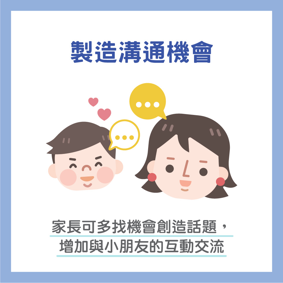 特別對於二至三歲幼兒,他們的說話表達能力未必到位,有時連家長都未能掌握溝通的意思。家長可多找機會創造話題,增加與小朋友的互動交流,同時根據小朋友現階段說話的表達能力作為基礎,語句逐步由簡單至複雜,一步步發展小朋友說話能力。例如:家長安排親子製作小食活動,在開心的過程中,多與小朋友描述他們的行為、重複他們的說話,都有助他們學習表達。家長可以由單字開始,到詞語,到簡單句子,再進深加形容詞、位置詞等。
