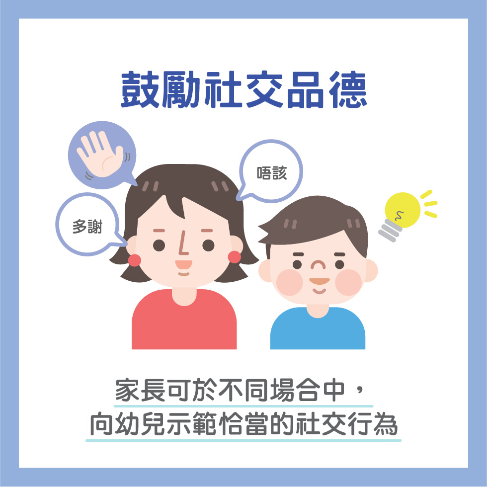 家長可於不同場合中,向幼兒示範恰當的社交行為,例如:與不同人打招呼、會說「唔該」「多謝」「對唔住」。當幼兒能夠表達簡單禮貌回應,家長應當即時運用「快·真·準」技巧讚賞孩子,例如:「你會同人講早晨,好有禮貌」。除了讚賞,家長亦可以運用為期三星期的「乖寶寶行為計劃表」以獎勵形式鼓勵小朋友建立正面行為。