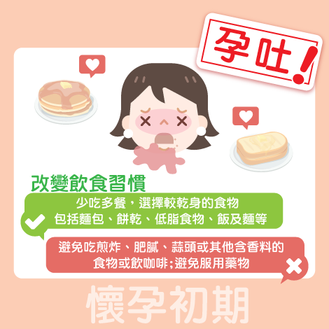 這段時期的婦女最常出現嘔吐的現象,只要改變飲食習慣便可以改善,例如:少吃多餐,選擇較乾身的食物 (包括:麵包、餅乾、低脂食物、飯及麵等),避免吃煎炸、肥膩、蒜頭或其他含香料的食物或飲咖啡;如出現嚴重嘔吐,可引致脫水及電解質不平衡。若有以下症狀,須立刻求診,接受適當的治理: